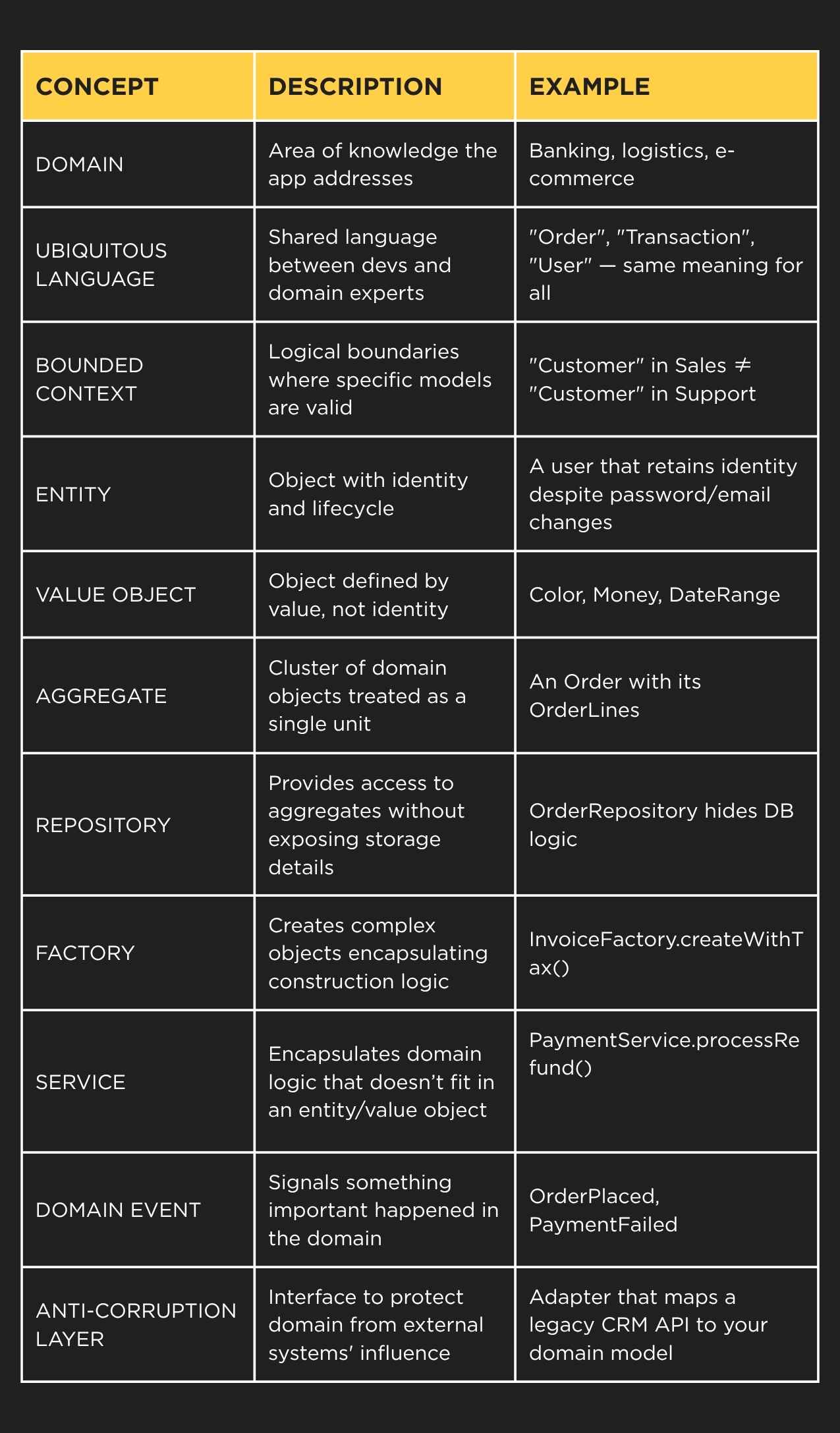 Domain-Driven Design is rich with concepts that guide developers and domain experts in the creation of effective software solutions. Here are some of the foundational ideas: